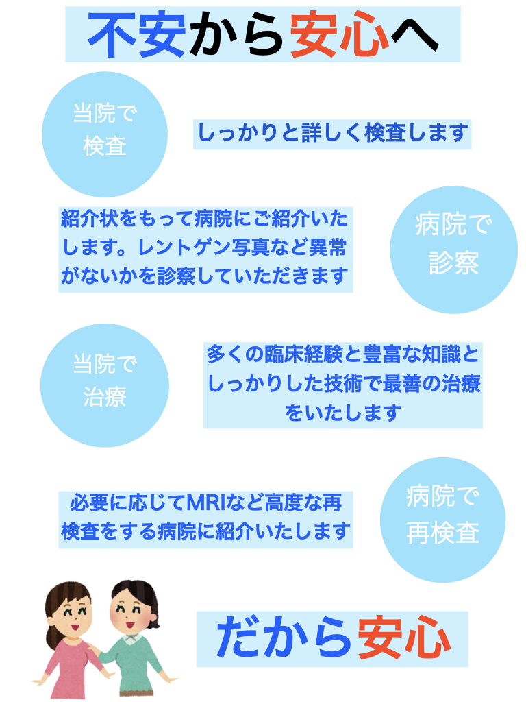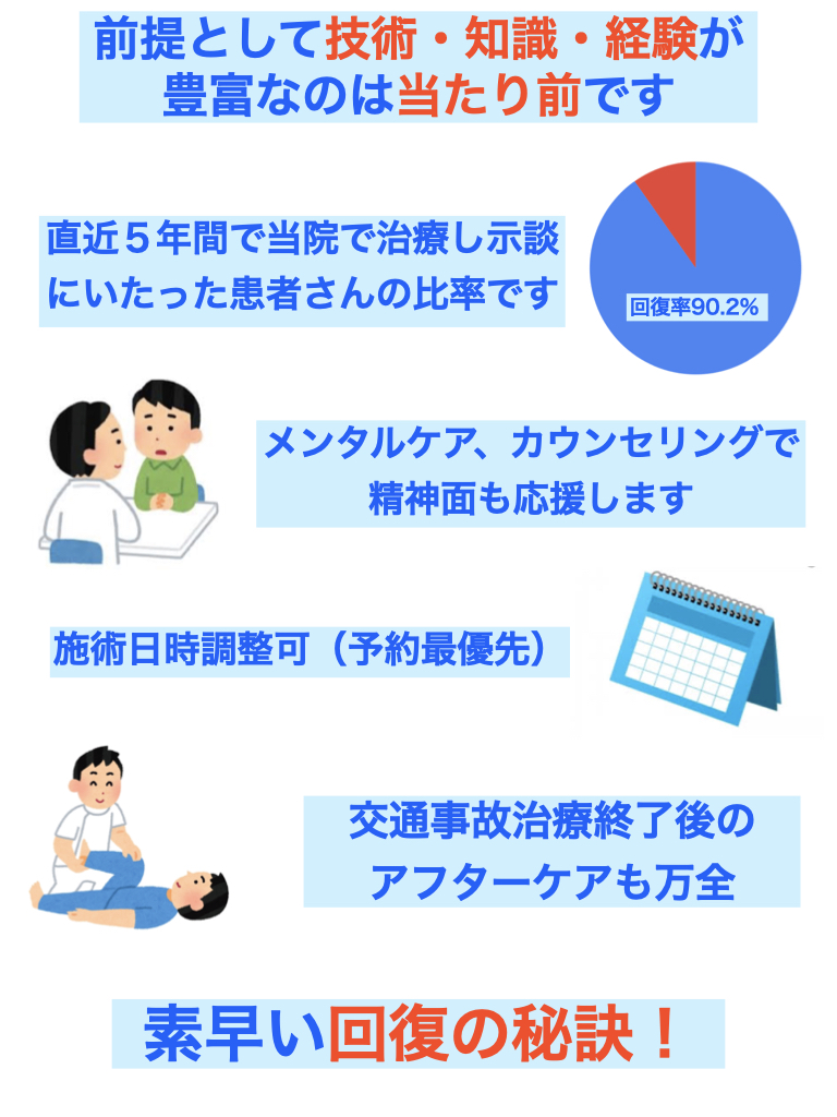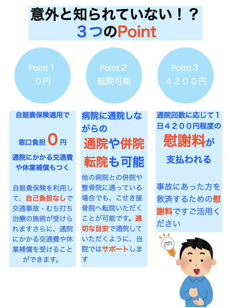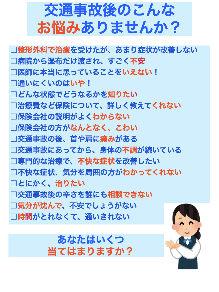 交通事故のムチウチ、手足のしびれでお困りの方 土日朝昼晩にも施術対応可能であり、専門医との連携(レントゲン、MRI診断)がとれて、保険の内容に詳しい接骨院です。